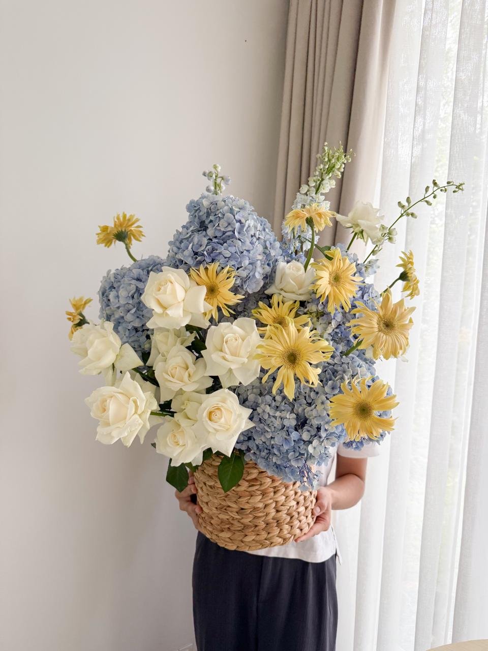 Cotton Cloud (L) Basket arrangement ft. hydrangea, roses and gerbera IDR 1.350.000